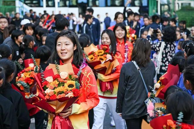 礼花喷薄而出,掌声如雷响起。当姚伟、吴海燕、陈晨等球员走下大巴时,瞬间被小球迷们团团围住。签名、合影,姑娘们耐心地满足着每一个要求。吴海燕在合影间隙,摸了摸小球员的头,满是期许地说道:“未来就靠你们啦!”